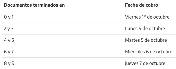 El calendario de pago será el siguiente, de acuerdo a la terminación del número del Documento Nacional de Identidad.